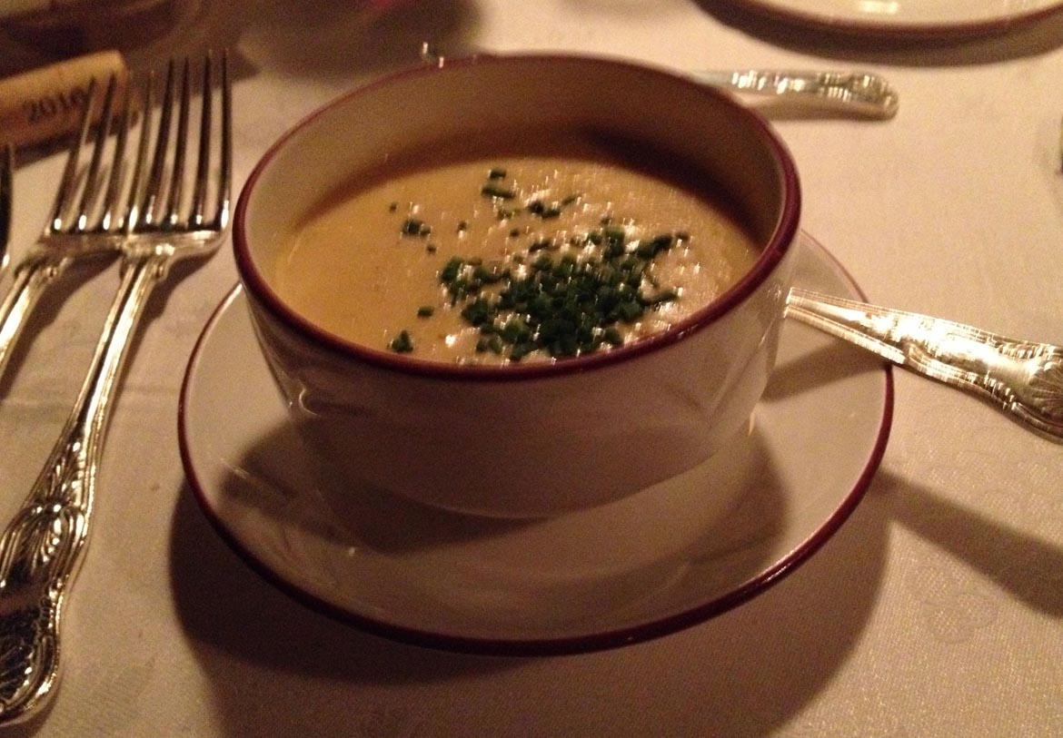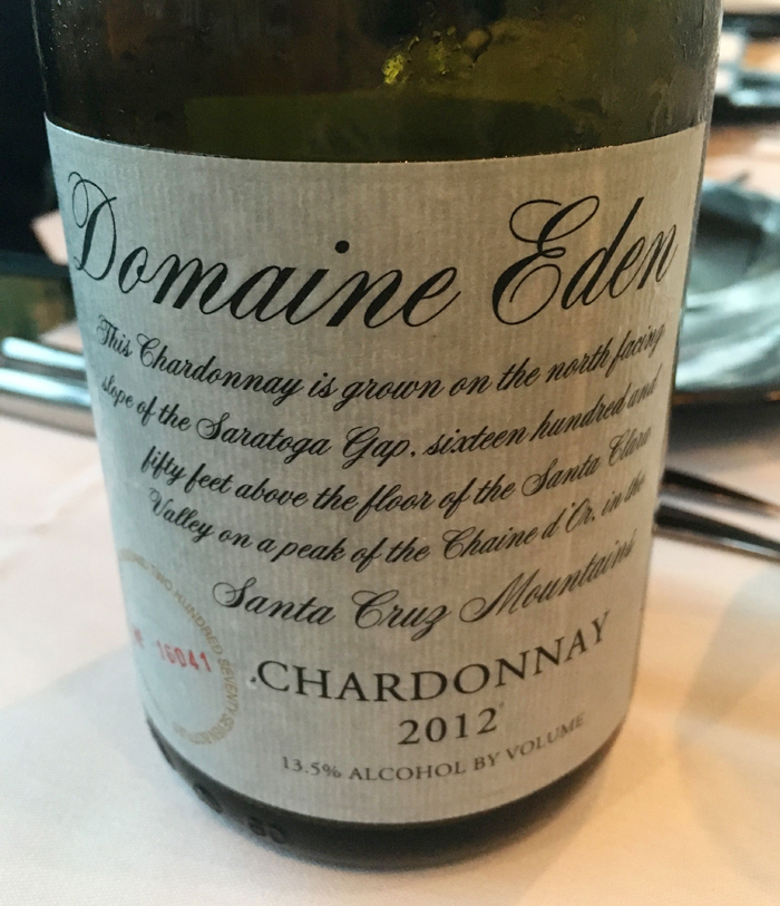Soon, we were served two new wines: a 2012 Chardonnay by Domaine Eden and a 2004 Austrian wine: Brundlmayer Cabernet Franc, “Vincent’s Cuvée”. Below is a picture of the Chardonnay. Andy and I had more of it with our dinner, as it was a better pairing with our food.