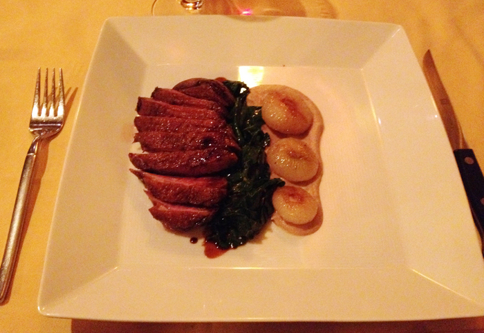 For our entrées, Andy selected the Grimauld Farms Duck Breast with celeriac and chestnut puree, swiss chard cipollini onions, and a pinot-cherry jus: