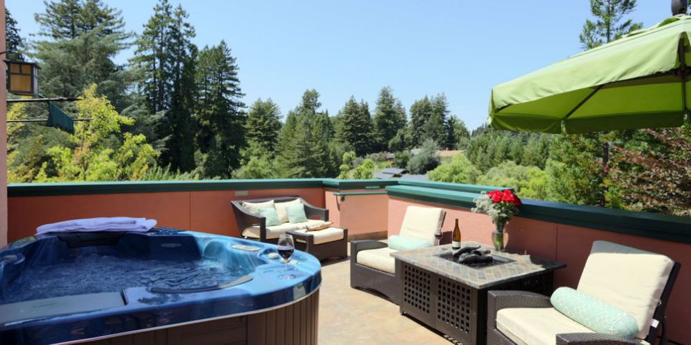 The terrace showcases a couple’s “love triangle” hot tub, a fire pit table, and a fountain. This suite and terrace is the perfect hideaway for a romantic wine country interlude.