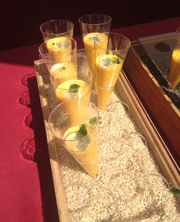 Upon arrival, we were greeted with a glass of 2013 Hall NV Sauvignon Blanc, and behind the first set of shrubs to the right of the entrance were these tuna and cucumber rolls with finger lime and wasabi in little wooden boats (pictured above). The next station we visited was even better, serving a chilled carrot soup with radish top pistou (pictured below). It was paired with a 2012 Walt “Dutton Ranch” Russian River Chardonnay. The soup was perfect for a very warm and sunny day and its flavor was amplified with a little curry and coconut. I was tempted to have a second. 😉 PS: Dutton Ranch is an excellent place of origin for a Chardonnay. Just google it and you’ll see what I mean. 🙂