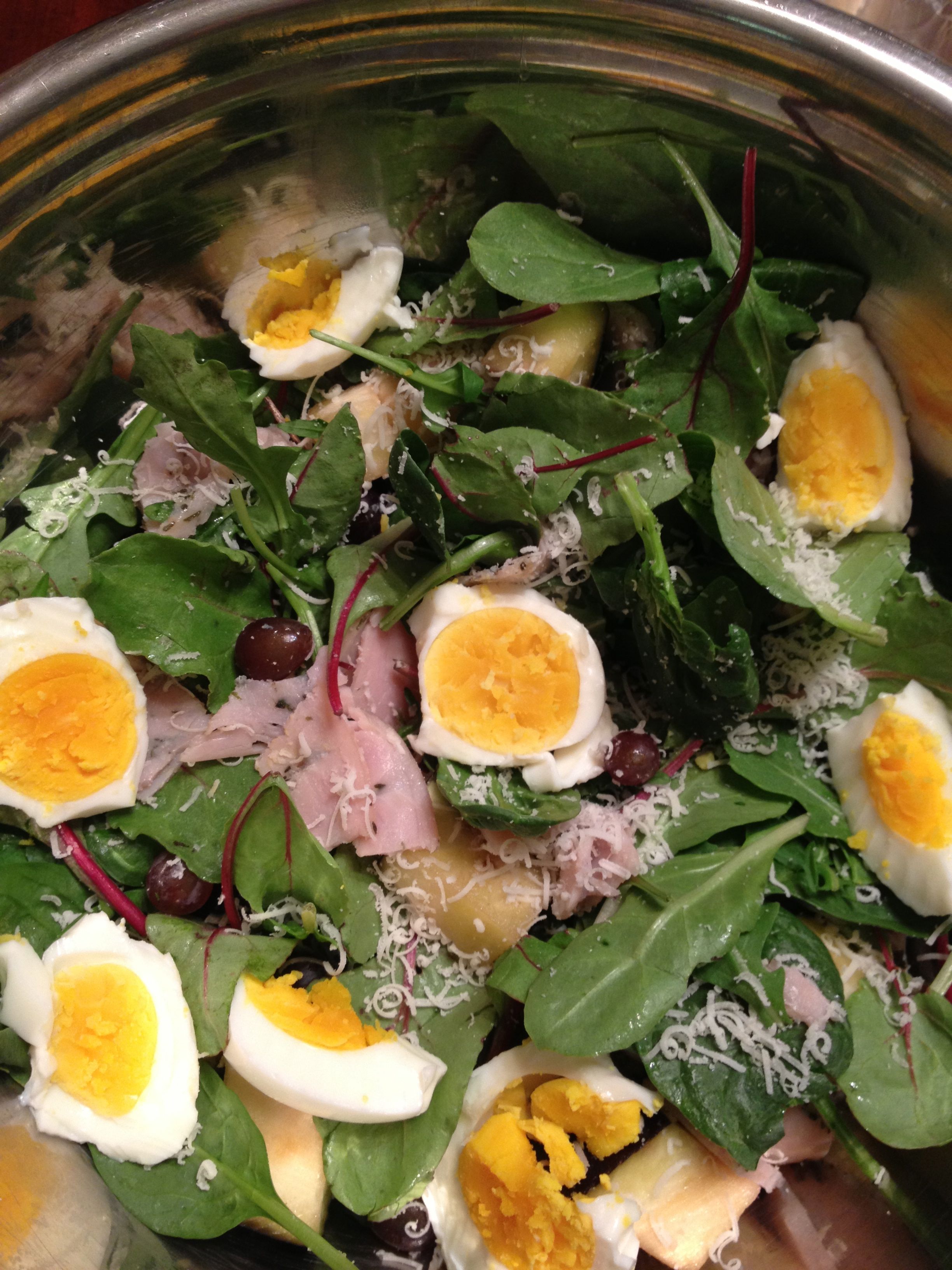 This was my awesome dinner tonight, almost all of it made from the ingredients on my shopping list today from Whole Foods. It was a Diestel Turkey salad (2 1/2 slices), on a bed of Organic Girl Super Greens (dandelion, arugula, spinach mix), 2 hard boiled eggs, 1-2 Tbs grated Parmigiano-Reggiano cheese, eggplant “croutons” and studded with about 1/2 cup of organic Grenache grapes. I don’t typically use dressing because the egg and cheese make everything so flavorful I don’t need it. 🙂