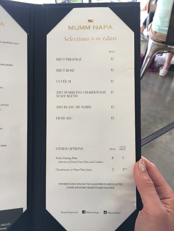 My friend and I had lunch at Brasswood Bar + Kitchen, (literally a stone’s throw from Ehlers Estate). We both ordered the diet-friendly Warm Brussels Sprouts Salad, with bacon, carmelized onion, parmesan, and soft cooked egg. I sipped a Diet Coke because I knew I was off to more wine tasting later in the day. My friend had to return to lunch after work, but I was on to Mumm Napa for sparkling wine!