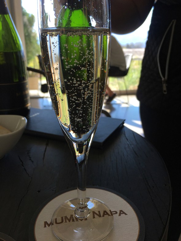 Driving to Mumm Napa down the Silverado Trail was the first time I noticed fire damage or any sign that a fire had come through at all. If you can imagine my trajectory, I was headed south from St. Helena on the Silverado Trail towards Napa, so the damage I began to see was on my left hand side, from the Atlas Peak fire. Still, I was surprised at how little damage there was overall, compared to how much damage had been reported on the radio, internet, and television. Here I was with dozens and dozens of wineries open around me on a gorgeous day, and hardly anyone in them because all of the Valley had (allegedly) burned down. I was giddy to be there and see for myself that it was business as usual. When I arrived at Mumm, I was ready to buy some more wine! But, first, more tasting. 🙂